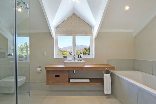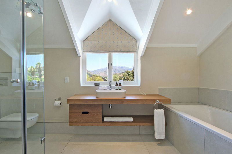 Bright and airy, the bathroom features a modern design with high, sloping ceilings that accentuate the natural light flooding in through a large window adorned with a decorative shade. A sleek wooden countertop holds a minimalist white sink, complemented by carefully arranged toiletries and a soft, rolled towel nearby.